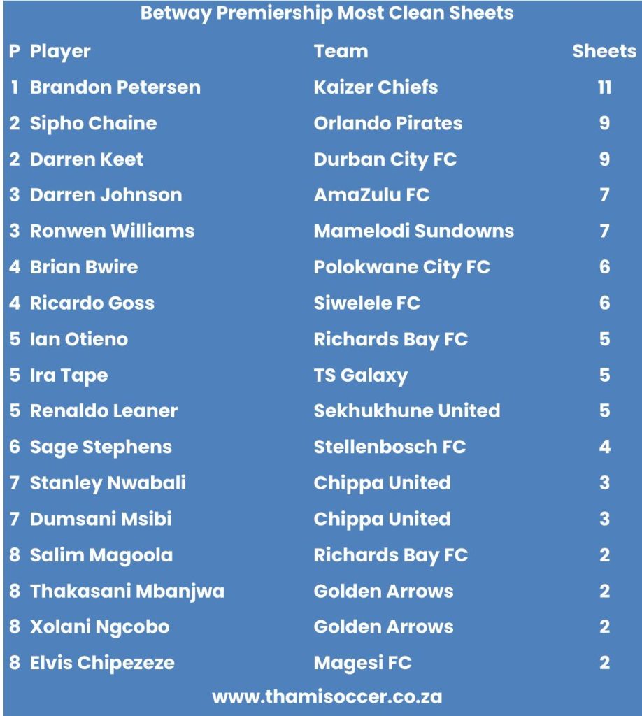 Betway Premiership Most Clean Sheets 28 January 2026 Posted on 2026-01-282026-01-29 By Thami Mshengu No Comments on Betway Premiership Most Clean Sheets 28 January 2026 (Visited 6 times, 1 visits today)Share this:TwitterWhatsAppPrintTumblrLinkedInFacebookTelegramRedditPocket Related Betway Premiership Tags:Brandon Petersen