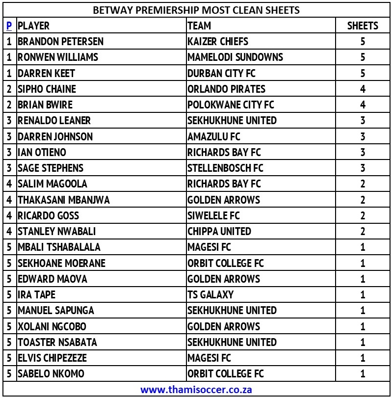 Betway Premiership Most Clean Sheets 28 September 2025 Posted on 2025-09-282025-09-29 By Thami Mshengu No Comments on Betway Premiership Most Clean Sheets 28 September 2025 (Visited 15 times, 1 visits today)Share this:TwitterWhatsAppPrintTumblrLinkedInFacebookTelegramRedditPocket Related Betway Premiership Tags:Brandon Petersen, Darren Keet, Ronwen Williams