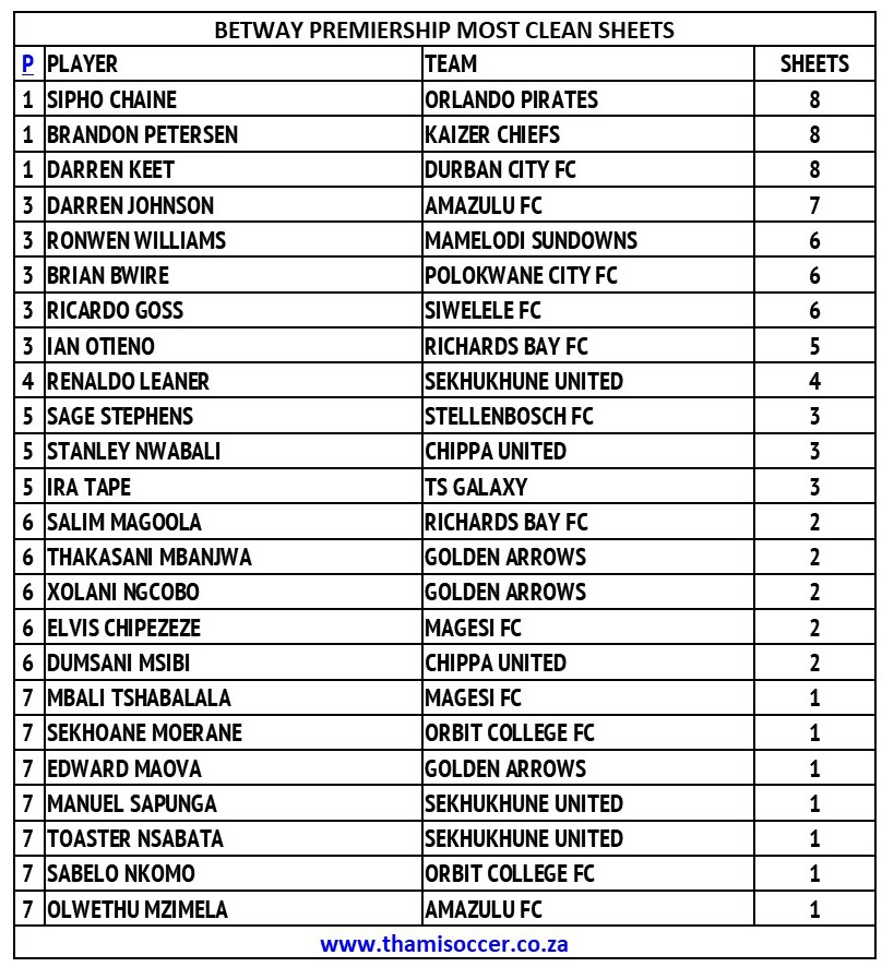 Betway Premiership Most Clean Sheets 3 December 2025 Posted on 2025-12-032025-12-04 By Thami Mshengu No Comments on Betway Premiership Most Clean Sheets 3 December 2025 (Visited 15 times, 3 visits today)Share this:TwitterWhatsAppPrintTumblrLinkedInFacebookTelegramRedditPocket Related Betway Premiership Tags:Brandon Petersen, Darren Keet, Sipho Chaine