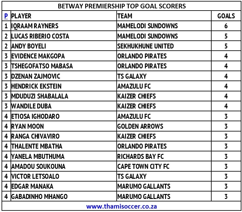 Betway Premiership Top Goal Scorers 18 January 2025 Posted on 2025-01-182025-01-19 By Thami Mshengu No Comments on Betway Premiership Top Goal Scorers 18 January 2025 (Visited 93 times, 1 visits today)Share this:TwitterWhatsAppPrintTumblrLinkedInFacebookTelegramRedditPocket Related Betway Premiership Tags:Iqraam Rayners