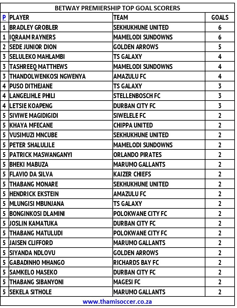 Betway Premiership Top Goal Scorers 19 October 2025 Posted on 2025-10-192025-11-03 By Thami Mshengu No Comments on Betway Premiership Top Goal Scorers 19 October 2025 (Visited 21 times, 1 visits today)Share this:TwitterWhatsAppPrintTumblrLinkedInFacebookTelegramRedditPocket Related Betway Premiership Tags:Bradley Grobler, Iqraam Rayners