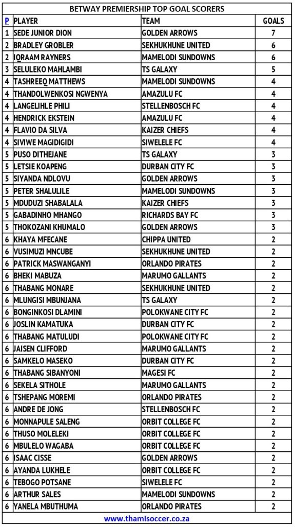 Betway Premiership Top Goal Scorers 5 November 2025 Posted on 2025-11-052025-11-23 By Thami Mshengu No Comments on Betway Premiership Top Goal Scorers 5 November 2025 (Visited 16 times, 1 visits today)Share this:TwitterWhatsAppPrintTumblrLinkedInFacebookTelegramRedditPocket Related Betway Premiership Tags:Sede Junior Dion