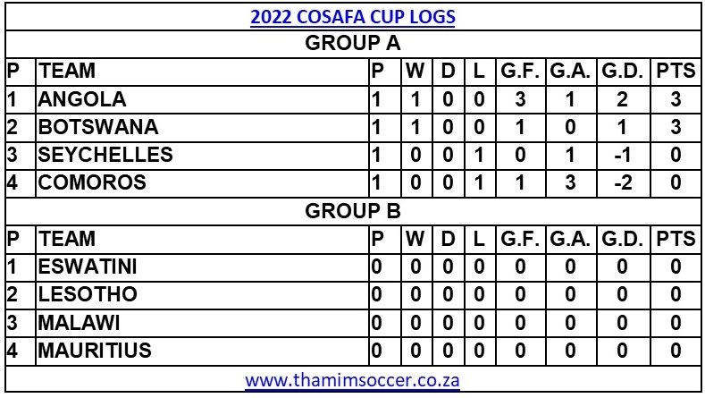 COSAFA Cup Logs 5 July 2022 Posted on 2022-07-052022-07-05 By Thami Mshengu No Comments on COSAFA Cup Logs 5 July 2022 (Visited 57 times, 1 visits today)Share this:TwitterWhatsAppPrintTumblrLinkedInFacebookTelegramRedditPocket Related COSAFA Cup Tags:Angola