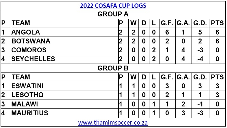 COSAFA Cup Logs 7 July 2022 Posted on 2022-07-082022-07-08 By Thami Mshengu No Comments on COSAFA Cup Logs 7 July 2022 (Visited 64 times, 1 visits today)Share this:TwitterWhatsAppPrintTumblrLinkedInFacebookTelegramRedditPocket Related COSAFA Cup Tags:Angola