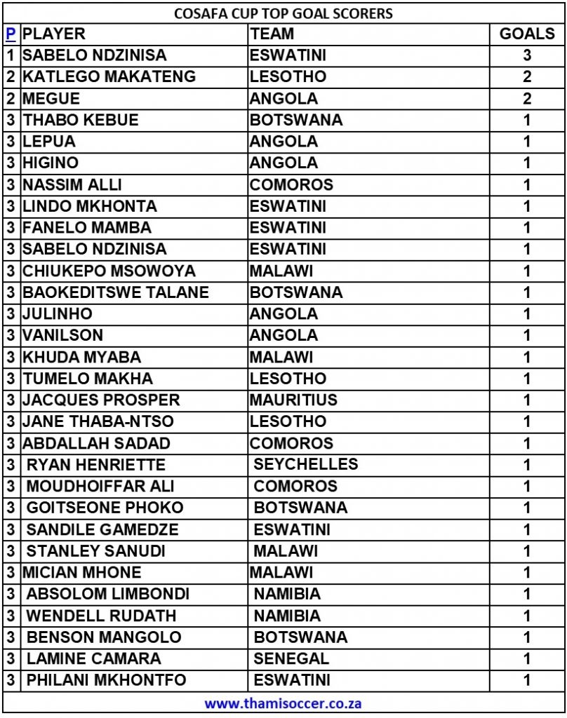 COSAFA Cup Top Goal Scorers 13 July 2022 Posted on 2022-07-142022-07-14 By Thami Mshengu No Comments on COSAFA Cup Top Goal Scorers 13 July 2022 (Visited 127 times, 1 visits today)Share this:TwitterWhatsAppPrintTumblrLinkedInFacebookTelegramRedditPocket Related COSAFA Cup Tags:Sabelo Ndzinisa