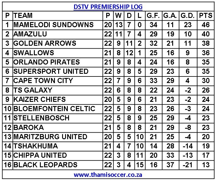 DStv Premiership Log 12 April 2021 Posted on 2021-04-122021-05-02 By Thami Mshengu No Comments on DStv Premiership Log 12 April 2021 (Visited 45 times, 1 visits today)Share this:TwitterWhatsAppPrintTumblrLinkedInFacebookTelegramRedditPocket Related Betway Premiership Tags:Mamelodi Sundowns