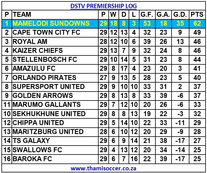 DStv Premiership Log 14 May 2022 Posted on 2022-05-162022-05-18 By Thami Mshengu No Comments on DStv Premiership Log 14 May 2022 (Visited 94 times, 1 visits today)Share this:TwitterWhatsAppPrintTumblrLinkedInFacebookTelegramRedditPocket Related Betway Premiership Tags:Mamelodi Sundowns