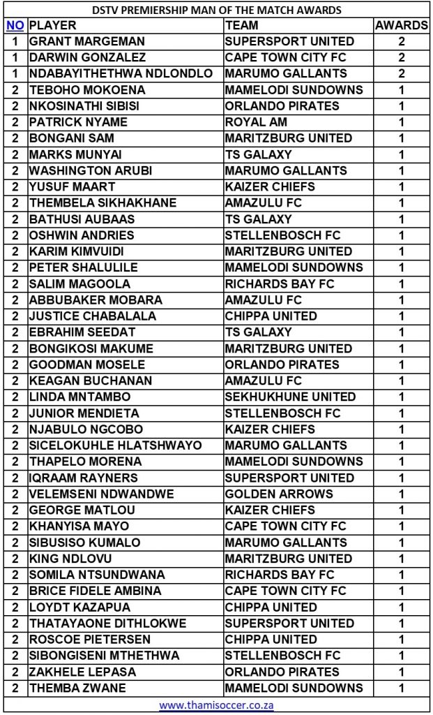 DStv Premiership Man Of The Match Awards 11 September 2022 Posted on 2022-09-122022-10-07 By Thami Mshengu No Comments on DStv Premiership Man Of The Match Awards 11 September 2022 (Visited 78 times, 1 visits today)Share this:TwitterWhatsAppPrintTumblrLinkedInFacebookTelegramRedditPocket Related Betway Premiership Tags:Darwin Gonzalez, Grant Margeman, Ndabayithethwa Ndlondlo