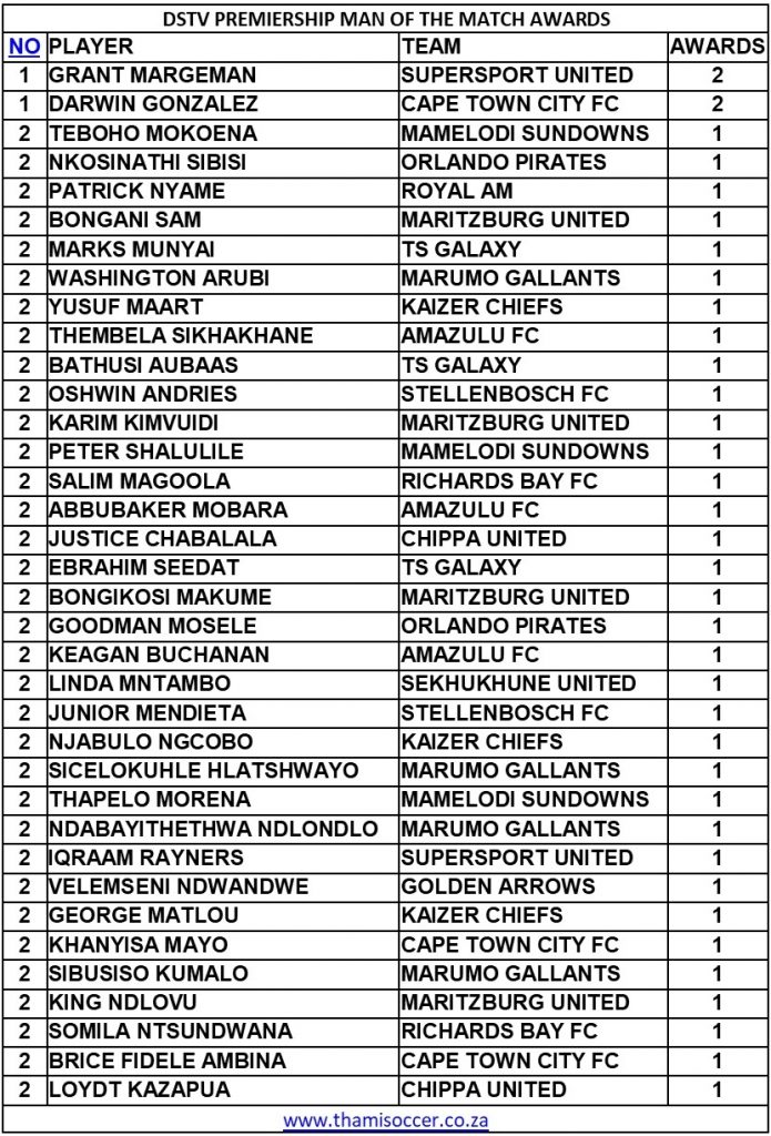 DStv Premiership Man Of The Match Awards 7 September 2022 Posted on 2022-09-082022-10-07 By Thami Mshengu No Comments on DStv Premiership Man Of The Match Awards 7 September 2022 (Visited 28 times, 1 visits today)Share this:TwitterWhatsAppPrintTumblrLinkedInFacebookTelegramRedditPocket Related Betway Premiership Tags:Darwin Gonzalez, Grant Margeman