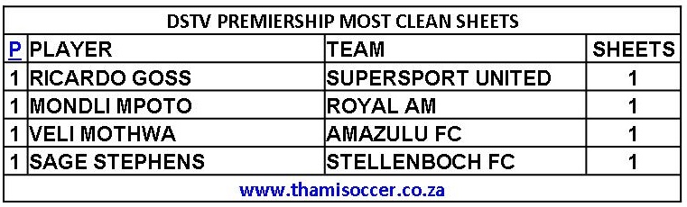 DStv Premiership Most Clean Sheets 5 August 2023 Posted on 2023-08-052023-08-17 By Thami Mshengu No Comments on DStv Premiership Most Clean Sheets 5 August 2023 (Visited 52 times, 1 visits today)Share this:TwitterWhatsAppPrintTumblrLinkedInFacebookTelegramRedditPocket Related Betway Premiership Tags:Mondli Mpoto, Ricardo Goss, Sage Stephens, Veli Mothwa