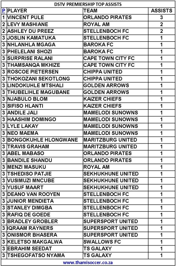 DStv Premiership Top Assists 19 September 2021 Posted on 2021-09-202021-09-20 By Thami Mshengu No Comments on DStv Premiership Top Assists 19 September 2021 (Visited 15 times, 1 visits today)Share this:TwitterWhatsAppPrintTumblrLinkedInFacebookTelegramRedditPocket Related Betway Premiership Tags:Vincent Pule