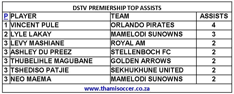 DStv Premiership Top Assists 3 October 2021 Posted on 2021-10-042021-10-04 By Thami Mshengu No Comments on DStv Premiership Top Assists 3 October 2021 (Visited 28 times, 1 visits today)Share this:TwitterWhatsAppPrintTumblrLinkedInFacebookTelegramRedditPocket Related Betway Premiership Tags:Vincent Pule