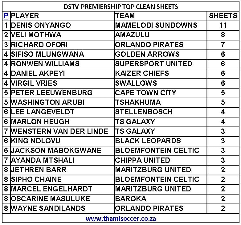 DStv Premiership Top Clean Sheets 18 April 2021 Posted on 2021-04-202021-04-20 By Thami Mshengu No Comments on DStv Premiership Top Clean Sheets 18 April 2021 (Visited 38 times, 1 visits today)Share this:TwitterWhatsAppPrintTumblrLinkedInFacebookTelegramRedditPocket Related Betway Premiership Tags:Denis Onyango