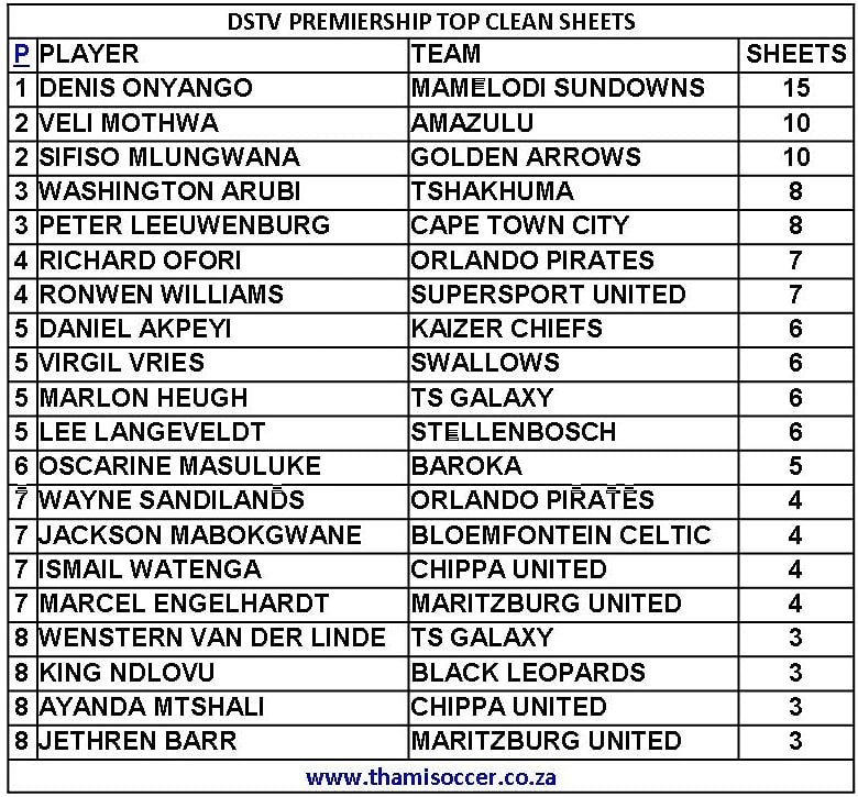 DStv Premiership Top Clean Sheets 19 May 2021 Posted on 2021-05-202021-05-20 By Thami Mshengu No Comments on DStv Premiership Top Clean Sheets 19 May 2021 (Visited 34 times, 1 visits today)Share this:TwitterWhatsAppPrintTumblrLinkedInFacebookTelegramRedditPocket Related Betway Premiership Tags:Denis Onyango