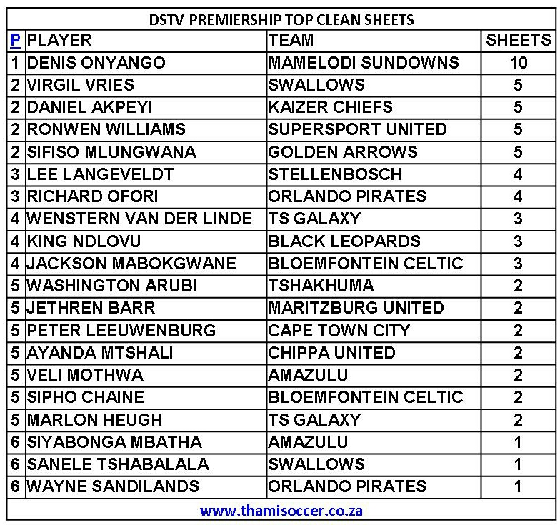DStv Premiership Top Clean Sheets 2 February 2021 Posted on 2021-02-022021-02-02 By Thami Mshengu No Comments on DStv Premiership Top Clean Sheets 2 February 2021 (Visited 21 times, 1 visits today)Share this:TwitterWhatsAppPrintTumblrLinkedInFacebookTelegramRedditPocket Related Betway Premiership Tags:Denis Onyango