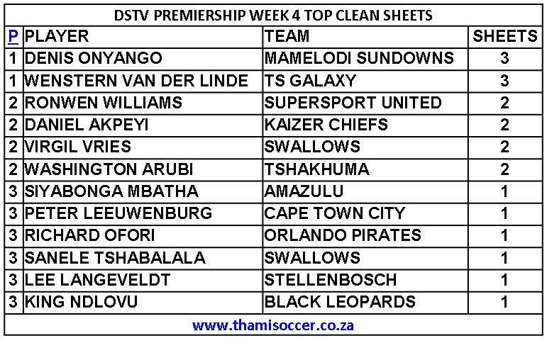 DStv Premiership Top Clean Sheets 22 November 2020 Posted on 2020-11-222020-11-22 By Thami Mshengu No Comments on DStv Premiership Top Clean Sheets 22 November 2020 (Visited 14 times, 1 visits today)Share this:TwitterWhatsAppPrintTumblrLinkedInFacebookTelegramRedditPocket Related Betway Premiership Tags:Denis Onyango, Wenstern van Der Linde
