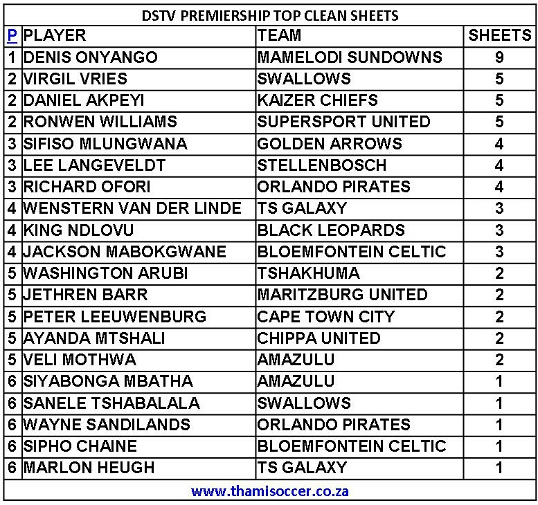 DStv Premiership Top Clean Sheets 24 January 2021 Posted on 2021-01-252021-01-25 By Thami Mshengu No Comments on DStv Premiership Top Clean Sheets 24 January 2021 (Visited 18 times, 1 visits today)Share this:TwitterWhatsAppPrintTumblrLinkedInFacebookTelegramRedditPocket Related Betway Premiership Tags:Denis Onyango