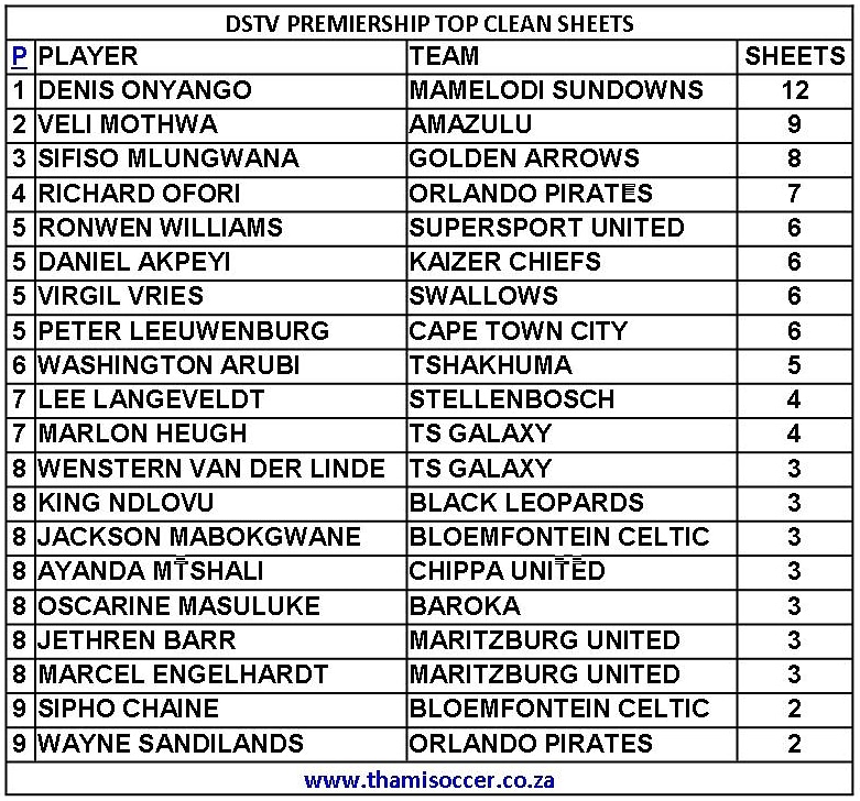 DStv Premiership Top Clean Sheets 27 April 2021 Posted on 2021-04-282021-04-28 By Thami Mshengu No Comments on DStv Premiership Top Clean Sheets 27 April 2021 (Visited 21 times, 1 visits today)Share this:TwitterWhatsAppPrintTumblrLinkedInFacebookTelegramRedditPocket Related Betway Premiership Tags:Denis Onyango