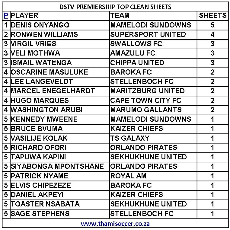 DStv Premiership Top Clean Sheets 3 October 2021 Posted on 2021-10-042021-10-04 By Thami Mshengu No Comments on DStv Premiership Top Clean Sheets 3 October 2021 (Visited 21 times, 1 visits today)Share this:TwitterWhatsAppPrintTumblrLinkedInFacebookTelegramRedditPocket Related Betway Premiership Tags:Denis Onyango