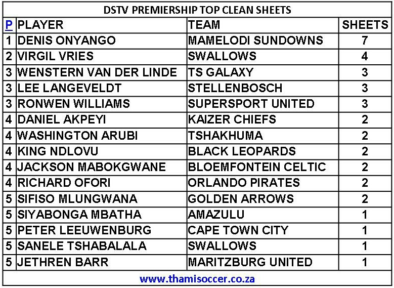DStv Premiership Top Clean Sheets 9 January 2021 Posted on 2021-01-102021-01-10 By Thami Mshengu No Comments on DStv Premiership Top Clean Sheets 9 January 2021 (Visited 66 times, 1 visits today)Share this:TwitterWhatsAppPrintTumblrLinkedInFacebookTelegramRedditPocket Related Betway Premiership Tags:Denis Onyango