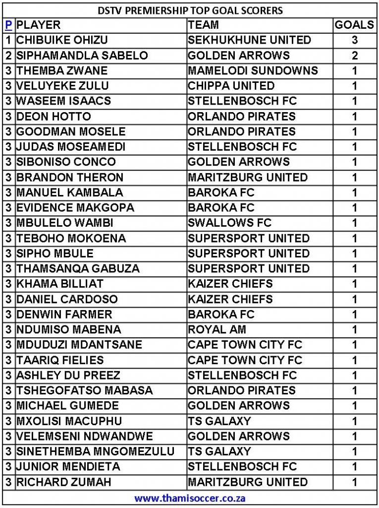 DStv Premiership Top Goal Scorers 11 September 2021 Posted on 2021-09-122021-09-12 By Thami Mshengu No Comments on DStv Premiership Top Goal Scorers 11 September 2021 (Visited 31 times, 1 visits today)Share this:TwitterWhatsAppPrintTumblrLinkedInFacebookTelegramRedditPocket Related Betway Premiership Tags:Chibuike Ohizu