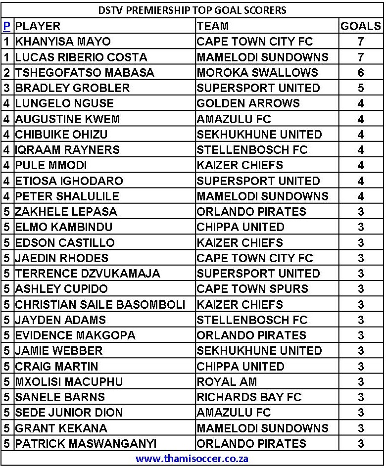 DStv Premiership Top Goal Scorers 17 December 2023 Posted on 2023-12-172023-12-18 By Thami Mshengu No Comments on DStv Premiership Top Goal Scorers 17 December 2023 (Visited 48 times, 1 visits today)Share this:TwitterWhatsAppPrintTumblrLinkedInFacebookTelegramRedditPocket Related Betway Premiership Tags:Khanyisa Mayo, Lucas Ribeiro Costa