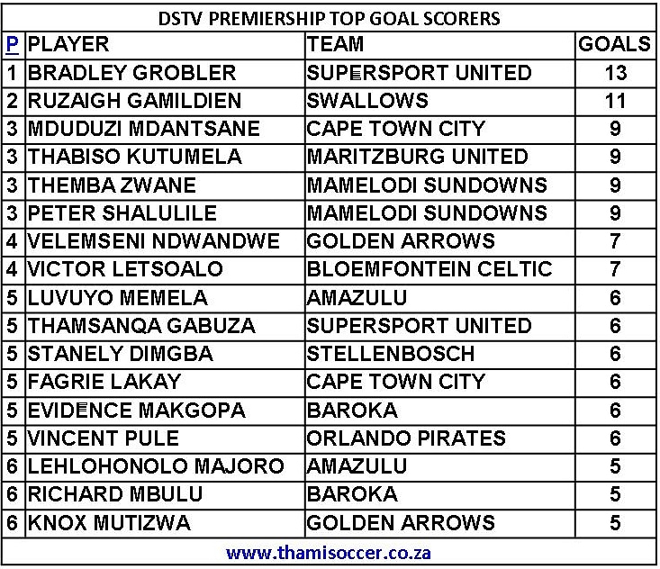 DStv Premiership Top Goal Scorers 18 April 2021 Posted on 2021-04-202021-04-20 By Thami Mshengu No Comments on DStv Premiership Top Goal Scorers 18 April 2021 (Visited 52 times, 1 visits today)Share this:TwitterWhatsAppPrintTumblrLinkedInFacebookTelegramRedditPocket Related Betway Premiership Tags:Bradley Grobler