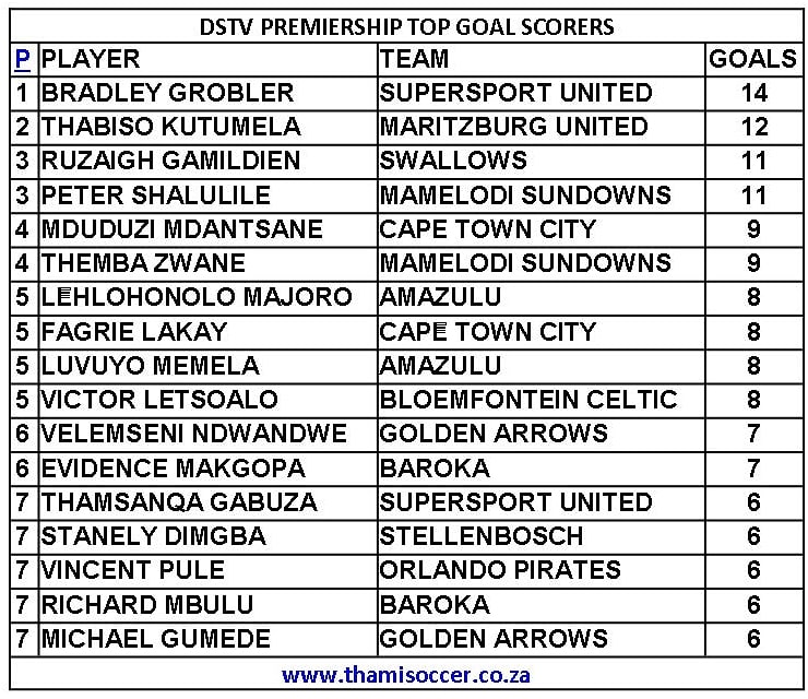 DStv Premiership Top Goal Scorers 19 May 2021 Posted on 2021-05-202021-05-20 By Thami Mshengu No Comments on DStv Premiership Top Goal Scorers 19 May 2021 (Visited 28 times, 1 visits today)Share this:TwitterWhatsAppPrintTumblrLinkedInFacebookTelegramRedditPocket Related Betway Premiership Tags:Bradley Grobler