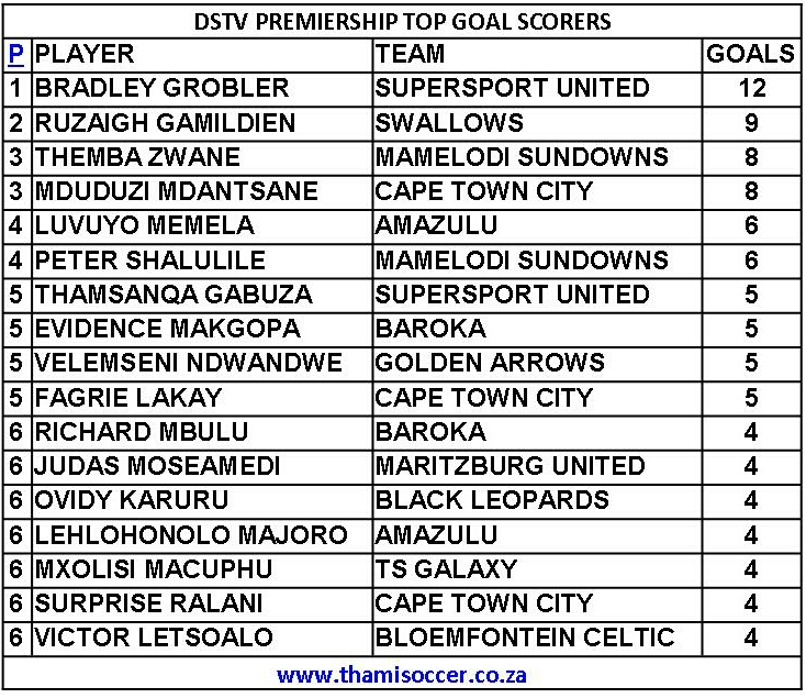 DStv Premiership Top Goal Scorers 2 February 2021 Posted on 2021-02-022021-02-13 By Thami Mshengu No Comments on DStv Premiership Top Goal Scorers 2 February 2021 (Visited 31 times, 1 visits today)Share this:TwitterWhatsAppPrintTumblrLinkedInFacebookTelegramRedditPocket Related Betway Premiership Tags:Bradley Grobler