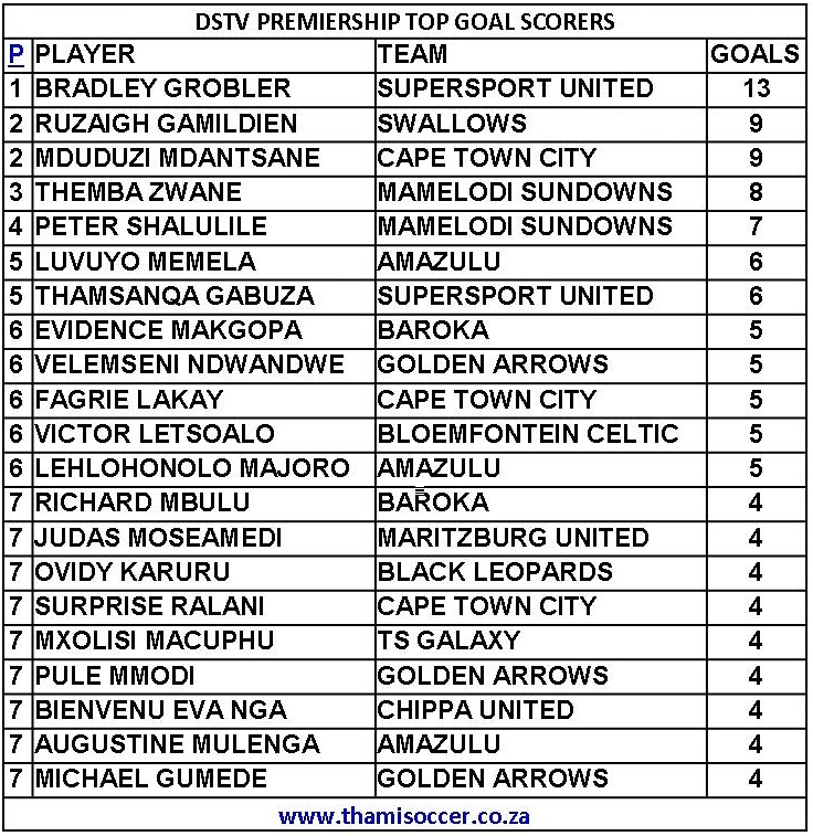 DStv Premiership Top Goal Scorers 23 February 2021 Posted on 2021-02-242021-02-24 By Thami Mshengu No Comments on DStv Premiership Top Goal Scorers 23 February 2021 (Visited 40 times, 1 visits today)Share this:TwitterWhatsAppPrintTumblrLinkedInFacebookTelegramRedditPocket Related Betway Premiership Tags:Bradley Grobler