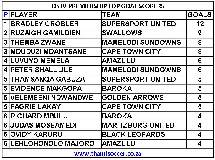 DStv Premiership Top Goal Scorers 29 January 2021 Posted on 2021-01-302021-01-30 By Thami Mshengu No Comments on DStv Premiership Top Goal Scorers 29 January 2021 (Visited 14 times, 1 visits today)Share this:TwitterWhatsAppPrintTumblrLinkedInFacebookTelegramRedditPocket Related Betway Premiership Tags:Bradley Grobler