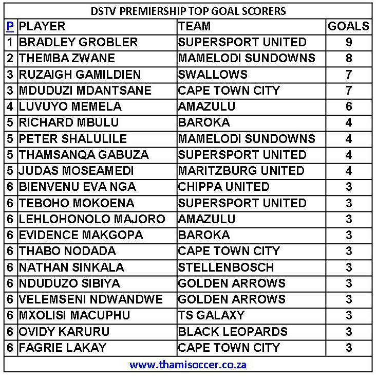 DStv Premiership Top Goal Scorers 9 January 2021 Posted on 2021-01-102021-01-10 By Thami Mshengu No Comments on DStv Premiership Top Goal Scorers 9 January 2021 (Visited 36 times, 1 visits today)Share this:TwitterWhatsAppPrintTumblrLinkedInFacebookTelegramRedditPocket Related Betway Premiership Tags:Bradley Grobler
