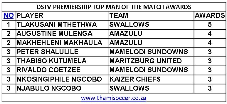DStv Premiership Top Man Of The Match Awards 1 May 2021 Posted on 2021-05-042021-05-04 By Thami Mshengu No Comments on DStv Premiership Top Man Of The Match Awards 1 May 2021 (Visited 170 times, 1 visits today)Share this:TwitterWhatsAppPrintTumblrLinkedInFacebookTelegramRedditPocket Related Betway Premiership Tags:Tlakusani Mthethwa