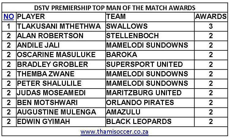 DStv Premiership Top Man Of The Match Awards 17 January 2021 Posted on 2021-01-182021-01-18 By Thami Mshengu No Comments on DStv Premiership Top Man Of The Match Awards 17 January 2021 (Visited 249 times, 1 visits today)Share this:TwitterWhatsAppPrintTumblrLinkedInFacebookTelegramRedditPocket Related Betway Premiership Tags:Tlakusani Mthethwa