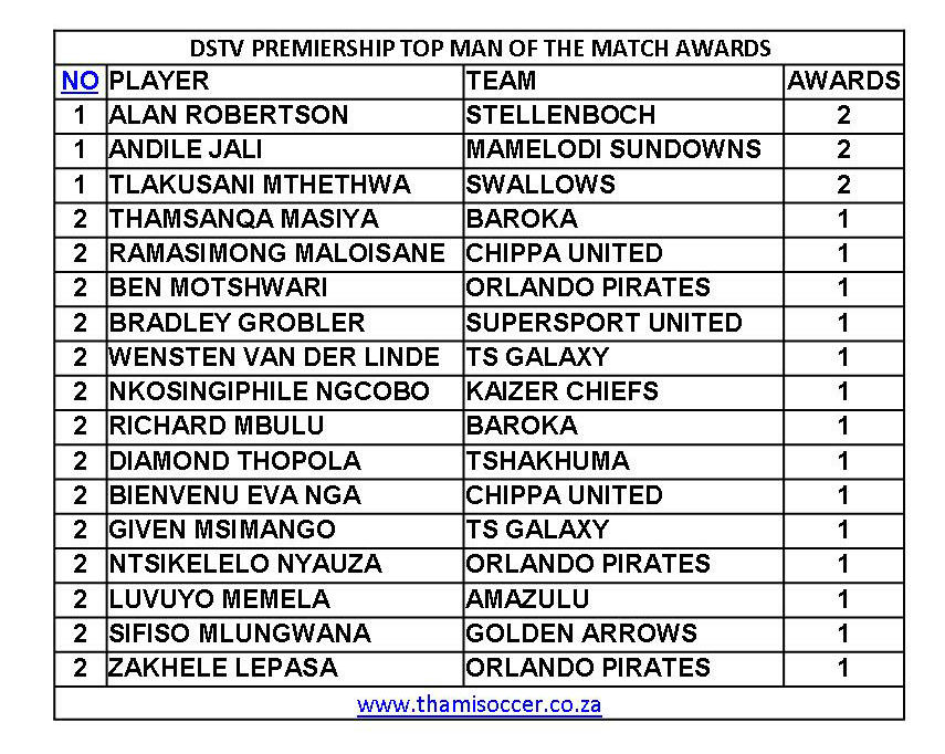DStv Premiership Top Man Of The Match Awards 21 November 2020 Posted on 2020-11-222020-11-22 By Thami Mshengu No Comments on DStv Premiership Top Man Of The Match Awards 21 November 2020 (Visited 64 times, 1 visits today)Share this:TwitterWhatsAppPrintTumblrLinkedInFacebookTelegramRedditPocket Related Betway Premiership