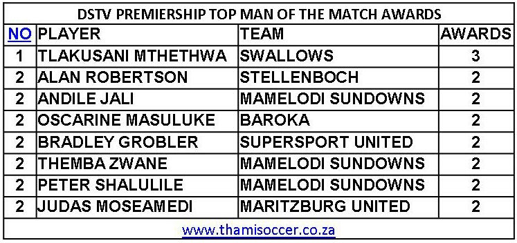 DStv Premiership Top Man Of The Match Awards 9 January 2021 Posted on 2021-01-102021-01-10 By Thami Mshengu No Comments on DStv Premiership Top Man Of The Match Awards 9 January 2021 (Visited 89 times, 1 visits today)Share this:TwitterWhatsAppPrintTumblrLinkedInFacebookTelegramRedditPocket Related Betway Premiership Tags:Tlakusani Mthethwa