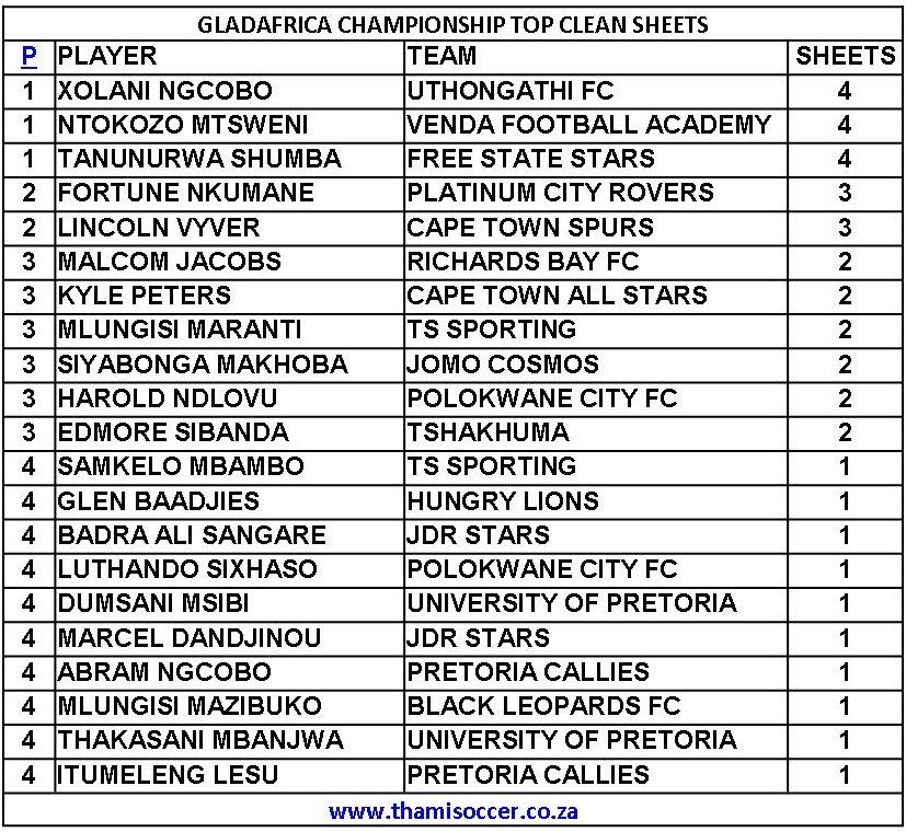 GladAfrica Championship Clean Sheets 25 September 2021 Posted on 2021-09-262021-09-28 By Thami Mshengu No Comments on GladAfrica Championship Clean Sheets 25 September 2021 (Visited 38 times, 1 visits today)Share this:TwitterWhatsAppPrintTumblrLinkedInFacebookTelegramRedditPocket Related Motsepe Foundation Championship Tags:Ntokozo Mtsweni, Tanunurwa Shumba, Xolani Ngcobo