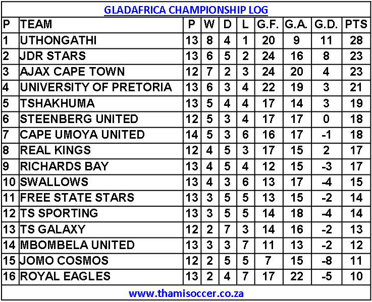 GladAfrica Championship Log 13 December 2019 Posted on 2019-12-13 By Thami Mshengu No Comments on GladAfrica Championship Log 13 December 2019 (Visited 13 times, 1 visits today)Share this:TwitterWhatsAppPrintTumblrLinkedInFacebookTelegramRedditPocket Related Motsepe Foundation Championship