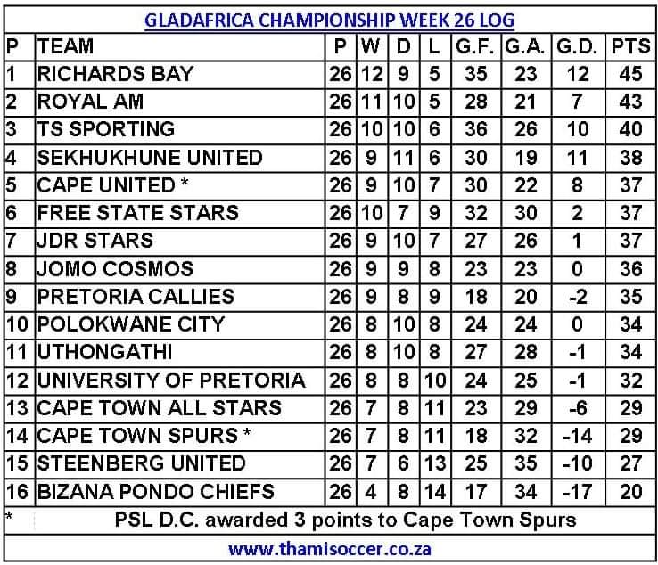 GladAfrica Championship Log 2 May 2021 Posted on 2021-05-052021-05-05 By Thami Mshengu No Comments on GladAfrica Championship Log 2 May 2021 (Visited 113 times, 1 visits today)Share this:TwitterWhatsAppPrintTumblrLinkedInFacebookTelegramRedditPocket Related Motsepe Foundation Championship Tags:Richards Bay FC