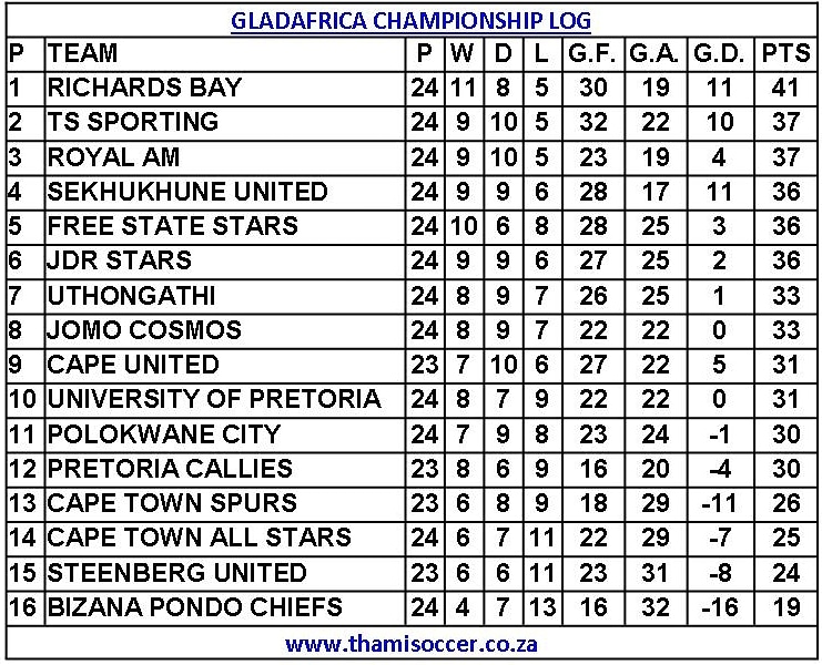 GladAfrica Championship Log 21 April 2021 Posted on 2021-04-212021-04-21 By Thami Mshengu No Comments on GladAfrica Championship Log 21 April 2021 (Visited 91 times, 1 visits today)Share this:TwitterWhatsAppPrintTumblrLinkedInFacebookTelegramRedditPocket Related Motsepe Foundation Championship Tags:Richards Bay FC