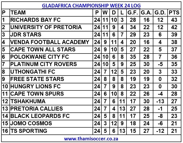GladAfrica Championship Log 3 April 2022 Posted on 2022-04-032022-04-03 By Thami Mshengu No Comments on GladAfrica Championship Log 3 April 2022 (Visited 85 times, 1 visits today)Share this:TwitterWhatsAppPrintTumblrLinkedInFacebookTelegramRedditPocket Related Motsepe Foundation Championship Tags:Richards Bay FC