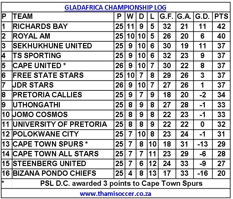 GladAfrica Championship Log 30 April 2021 Posted on 2021-05-012021-05-01 By Thami Mshengu No Comments on GladAfrica Championship Log 30 April 2021 (Visited 56 times, 1 visits today)Share this:TwitterWhatsAppPrintTumblrLinkedInFacebookTelegramRedditPocket Related Motsepe Foundation Championship Tags:Richards Bay FC