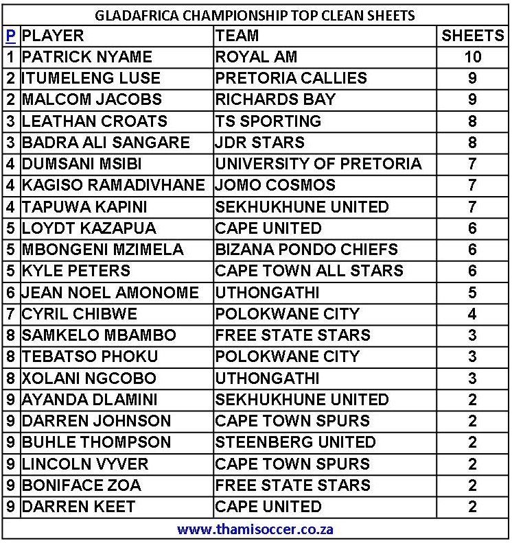 GladAfrica Championship Top Clean Sheets 10 April 2021 Posted on 2021-04-112021-04-12 By Thami Mshengu No Comments on GladAfrica Championship Top Clean Sheets 10 April 2021 (Visited 72 times, 1 visits today)Share this:TwitterWhatsAppPrintTumblrLinkedInFacebookTelegramRedditPocket Related Motsepe Foundation Championship Tags:Patrick Nyame