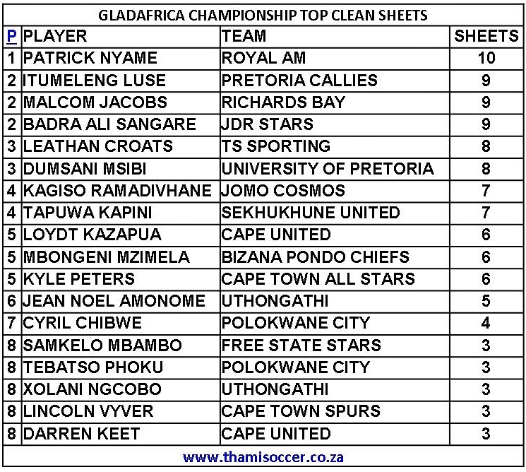 GladAfrica Championship Top Clean Sheets 13 April 2021 Posted on 2021-04-142021-04-14 By Thami Mshengu No Comments on GladAfrica Championship Top Clean Sheets 13 April 2021 (Visited 37 times, 1 visits today)Share this:TwitterWhatsAppPrintTumblrLinkedInFacebookTelegramRedditPocket Related Motsepe Foundation Championship Tags:Patrick Nyame