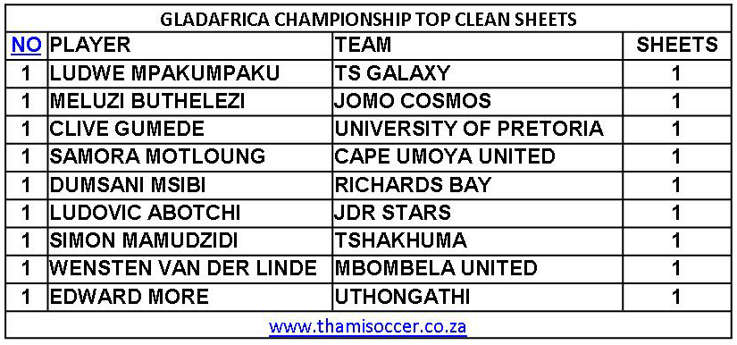 GladAfrica Championship Top Clean Sheets 13 September 2019 Posted on 2019-09-13 By Thami Mshengu No Comments on GladAfrica Championship Top Clean Sheets 13 September 2019 (Visited 22 times, 1 visits today)Share this:TwitterWhatsAppPrintTumblrLinkedInFacebookTelegramRedditPocket Related Motsepe Foundation Championship