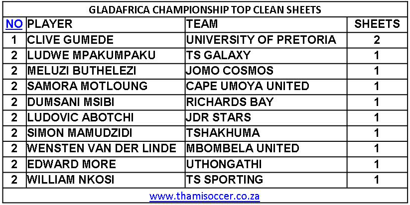 GladAfrica Championship Top Clean Sheets 14 September 2019 Posted on 2019-09-15 By Thami Mshengu No Comments on GladAfrica Championship Top Clean Sheets 14 September 2019 (Visited 44 times, 1 visits today)Share this:TwitterWhatsAppPrintTumblrLinkedInFacebookTelegramRedditPocket Related Betway Premiership
