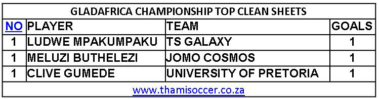 GladAfrica Championship Top Clean Sheets 18 August 2019 Posted on 2019-08-18 By Thami Mshengu No Comments on GladAfrica Championship Top Clean Sheets 18 August 2019 (Visited 13 times, 1 visits today)Share this:TwitterWhatsAppPrintTumblrLinkedInFacebookTelegramRedditPocket Related Motsepe Foundation Championship
