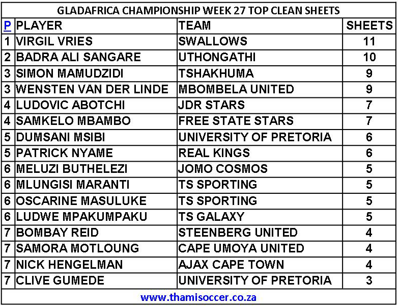 GladAfrica Championship Top Clean Sheets 19 August 2020 Posted on 2020-08-202020-08-20 By Thami Mshengu No Comments on GladAfrica Championship Top Clean Sheets 19 August 2020 (Visited 23 times, 1 visits today)Share this:TwitterWhatsAppPrintTumblrLinkedInFacebookTelegramRedditPocket Related Motsepe Foundation Championship