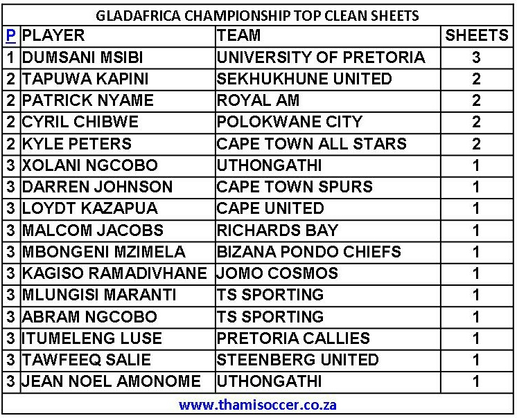 GladAfrica Championship Top Clean Sheets 20 December 2020 Posted on 2020-12-212020-12-21 By Thami Mshengu No Comments on GladAfrica Championship Top Clean Sheets 20 December 2020 (Visited 18 times, 1 visits today)Share this:TwitterWhatsAppPrintTumblrLinkedInFacebookTelegramRedditPocket Related Motsepe Foundation Championship Tags:Dumsani Msibi