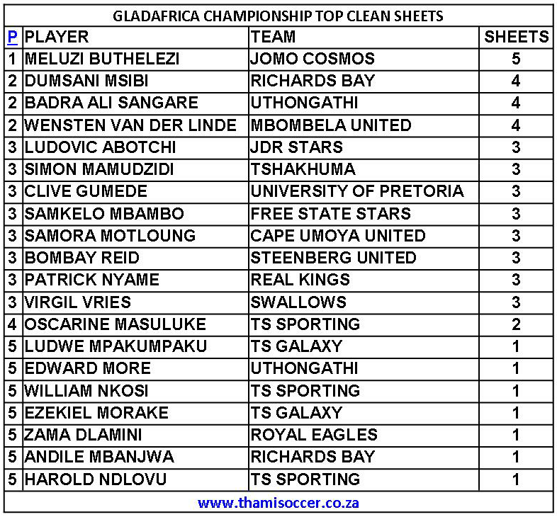 GladAfrica Championship Top Clean Sheets 20 November 2019 Posted on 2019-11-20 By Thami Mshengu No Comments on GladAfrica Championship Top Clean Sheets 20 November 2019 (Visited 15 times, 1 visits today)Share this:TwitterWhatsAppPrintTumblrLinkedInFacebookTelegramRedditPocket Related Motsepe Foundation Championship